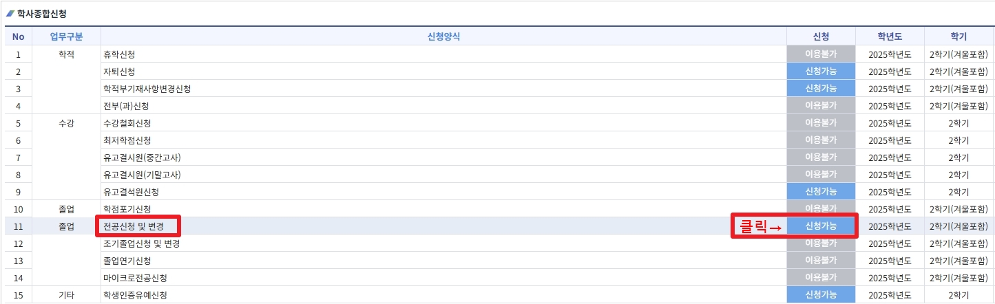 로그인 후 Campus > 학사공통 > 학사종합신청 > 전공신청 및 변경 클릭