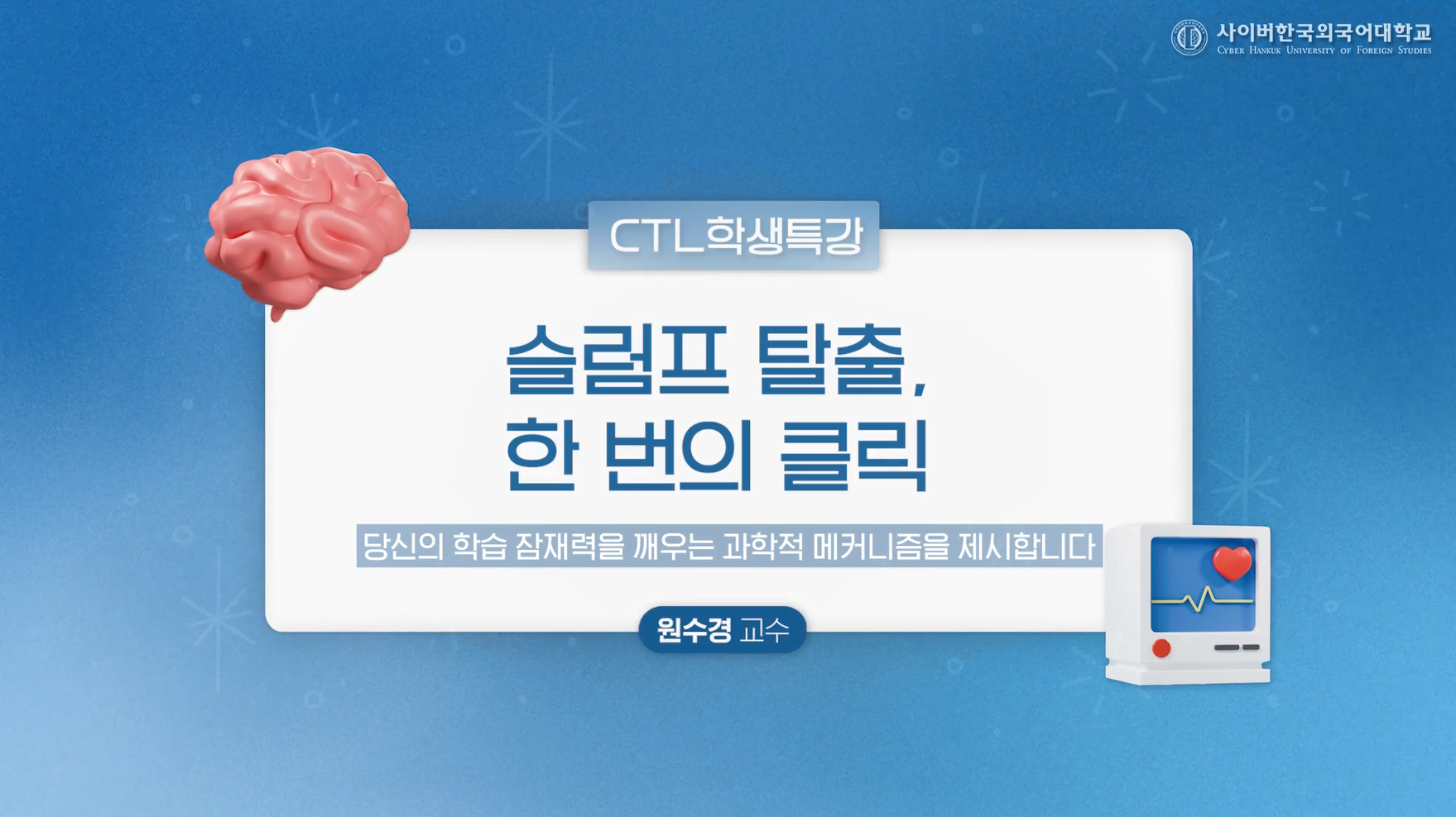 '내일부터 하자!'며 미루고 자책하는 당신을 위해 '슬럼프 탈출, 한번의 클릭'이라는 주제의 온라인 학생 특강을 마련하였습니다.